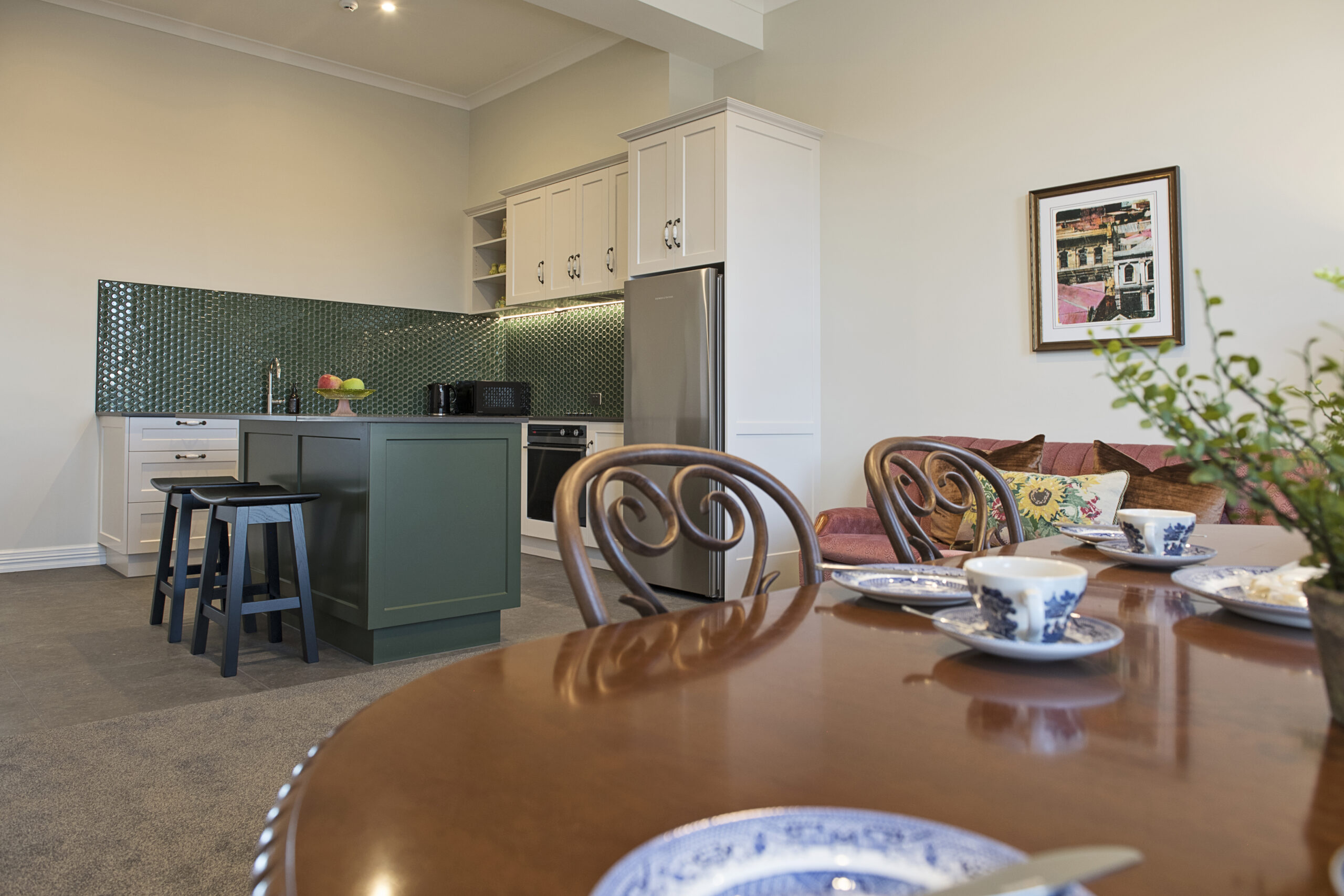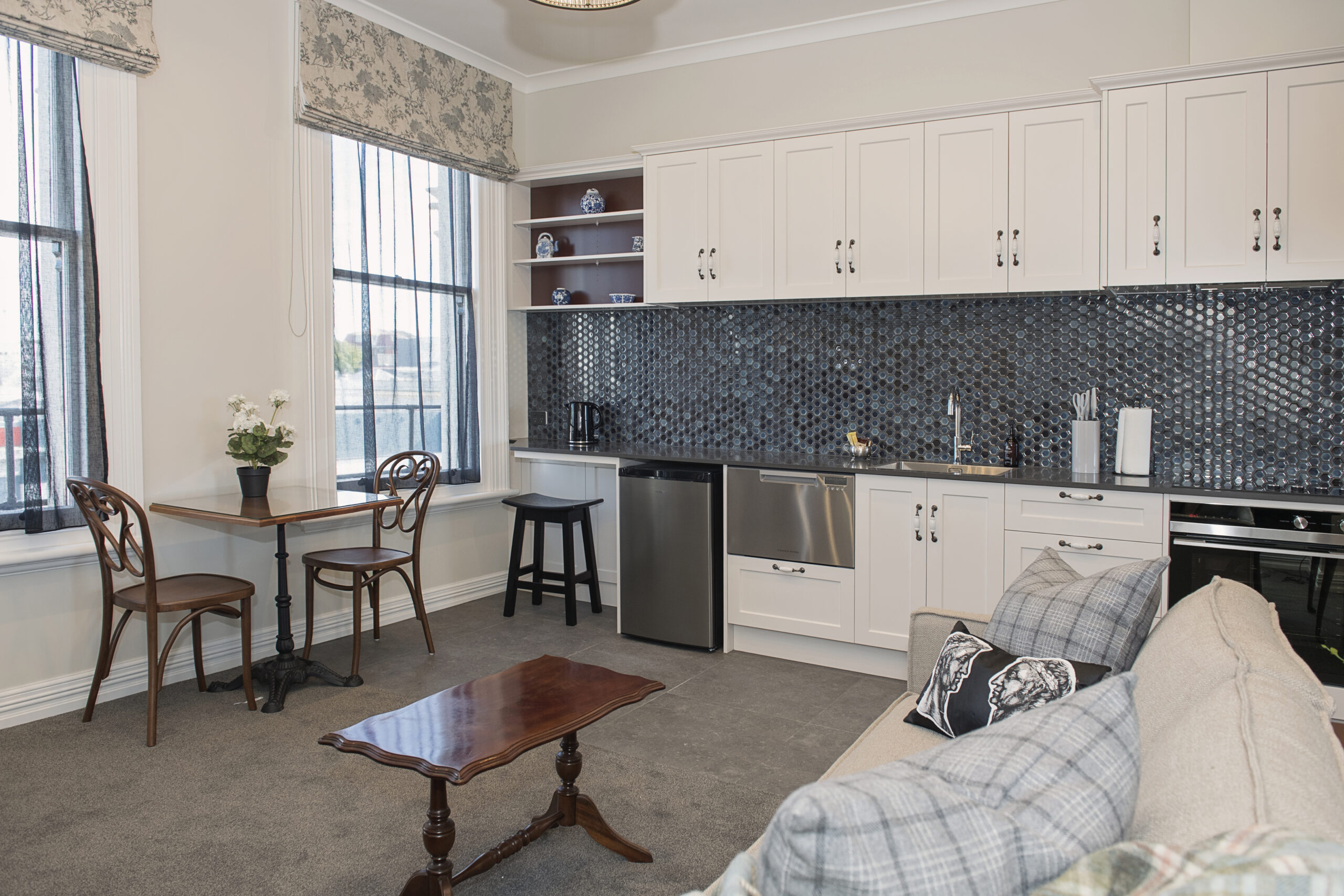 A shabby, run down character filled hotel was in need of some serious love. Interior Designer, Deborah Still was given the project and she has worked hard for a year or so on getting this back to a beautiful functioning set of apartments ready for occupants. It's huge, and there were so many details to think about, fixtures for the bathrooms, kitchen cabinets, artwork, tiles, bedheads, linen... the list just goes on and on. If you need a short term rental they'd be lovely and airy and in the heart of the CBD.